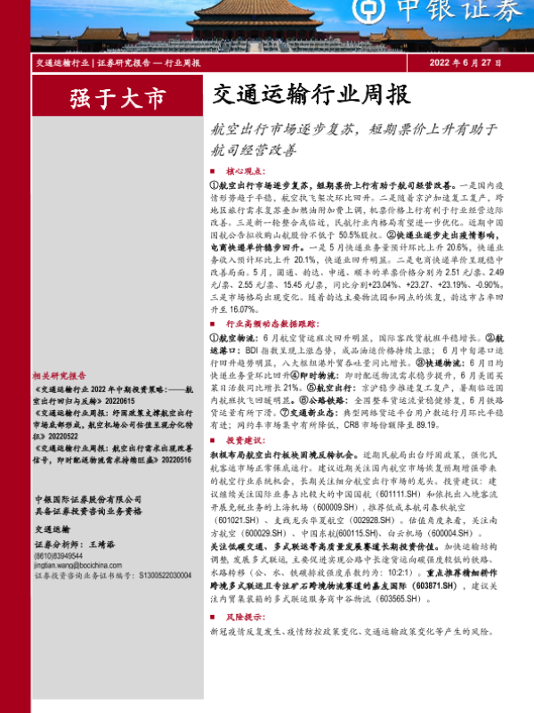 【中银证券】【20220627】交通运输行业周报:航空出行市场逐步复苏,短期票价上升有助于航司经营改善-25页 行业研究