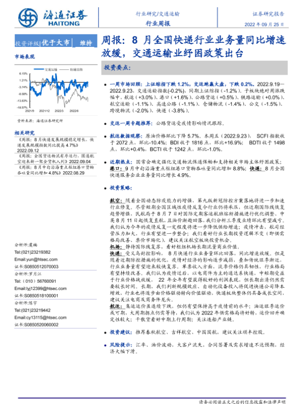 【海通证券】【20220925】物流行业周报:8月全国快递行业业务量同比增速放缓,交通运输业纾困政策出台-11页 行业研究
