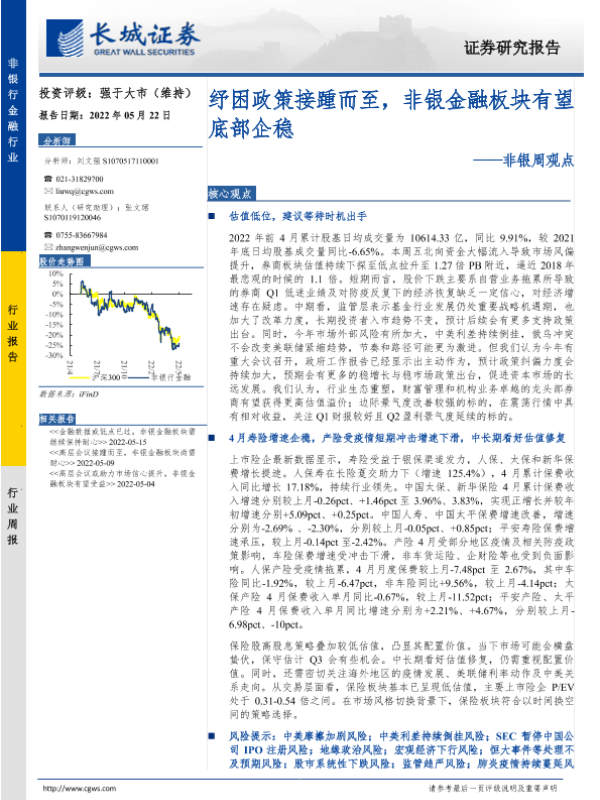 【长城证券】【20220522】非银周观点:纾困政策接踵而至,非银金融板块有望底部企稳-34页 行业研究