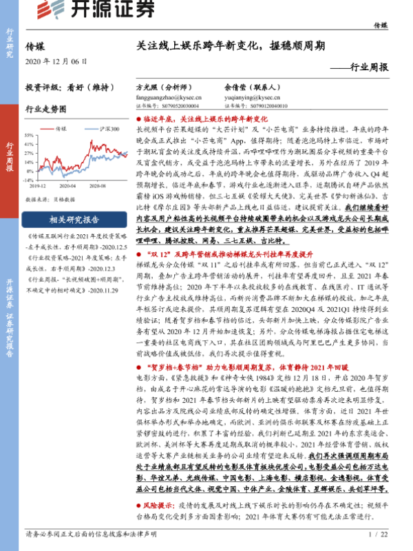 【开源证券】【20201206】20201206-开源证券-传媒行业周报:关注线上娱乐跨年新变化,握稳顺周期-22页 行业研究