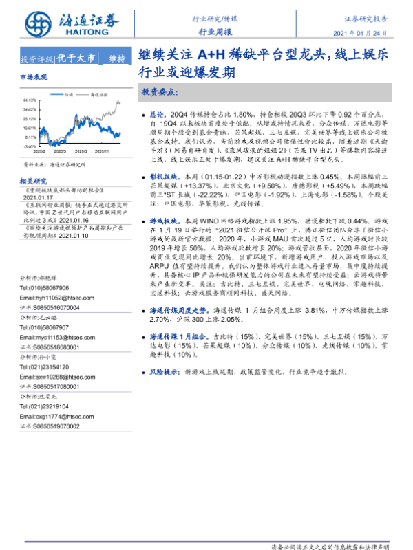 【海通证券】【20210124】20210124-海通证券-传媒行业周报:继续关注A+H稀缺平台型龙头,线上娱乐行业或迎爆发期-12页 行业研究