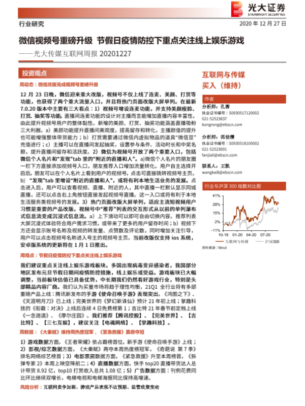 【光大证券】【20201227】光大传媒互联网周报:微信视频号重磅升级,节假日疫情防控下重点关注线上娱乐游戏-12页 行业研究