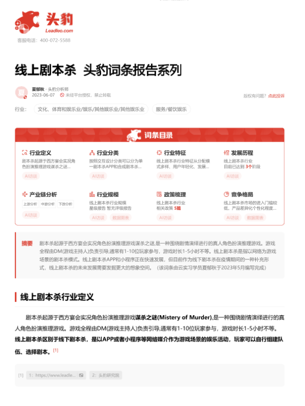 【头豹研究院】【20230913】线上剧本杀 头豹词条报告系列-13页 行业研究