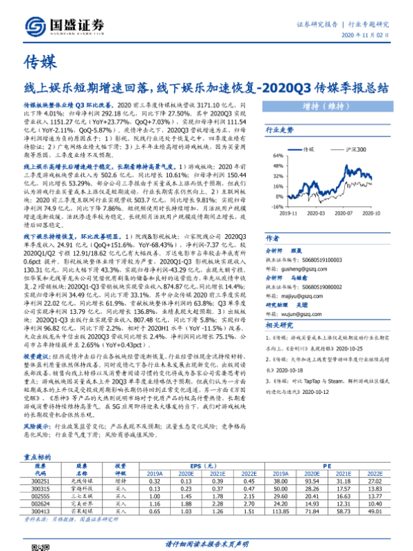 【国盛证券】【20201102】线上娱乐短期增速回落,线下娱乐加速恢复-2020Q3传媒季报总结-19页 行业研究