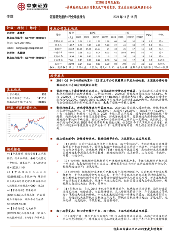 【中泰证券】【20211115】20211115-中泰证券-传媒2021Q3总结及展望:持续看好线上娱乐消费及线下场景复苏,重点关注游戏板块投资机会-22页 行业研究