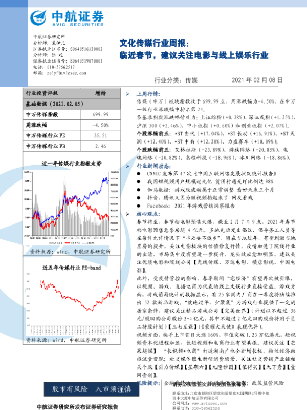 【中航证券】【20210208】20210208-中航证券-文化传媒行业周报:临近春节,建议关注电影与线上娱乐行业-7页 行业研究