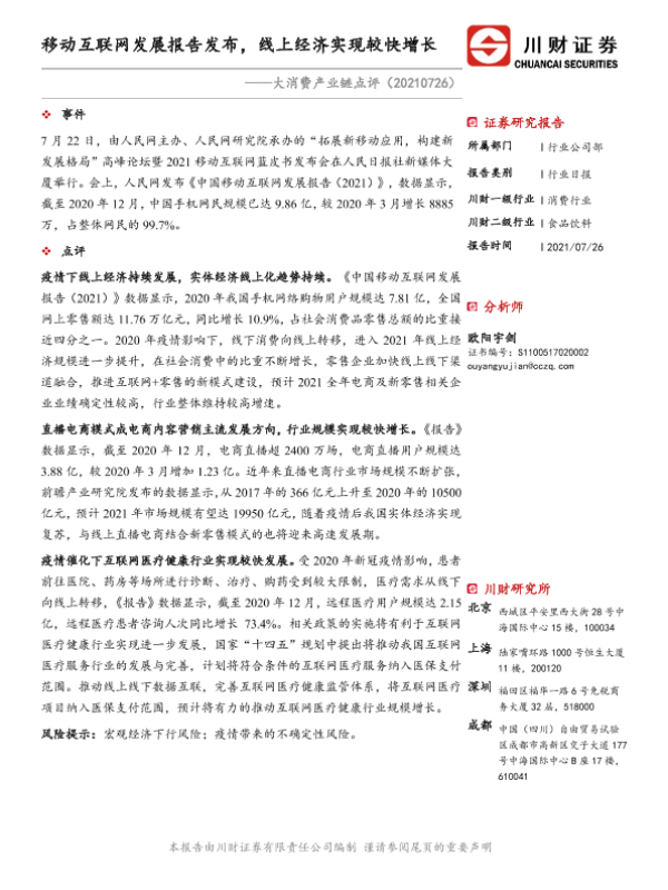 【川财证券】【20210726】大消费产业链点评:移动互联网发展报告发布,线上经济实现较快增长-2页 行业研究