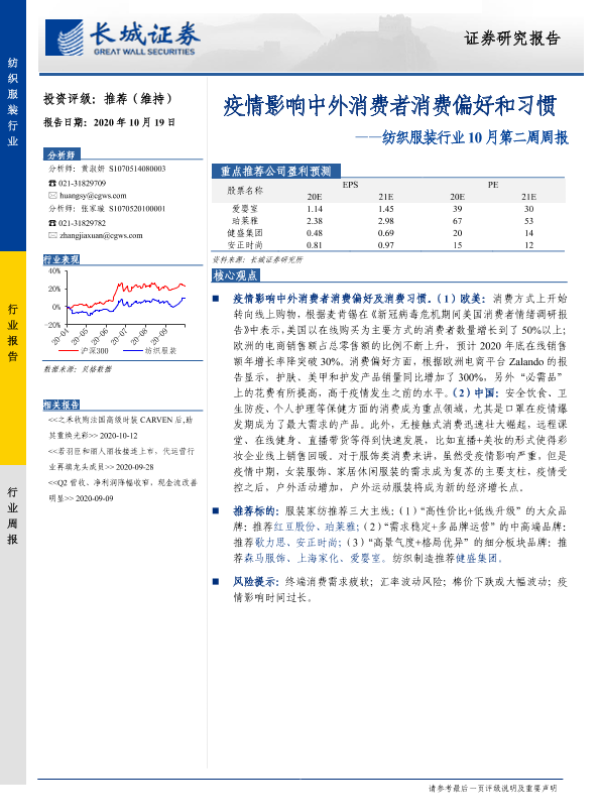 【长城证券】【20201019】20201019-长城证券-纺织服装行业10月第二周周报:疫情影响中外消费者消费偏好和习惯-22页 行业研究