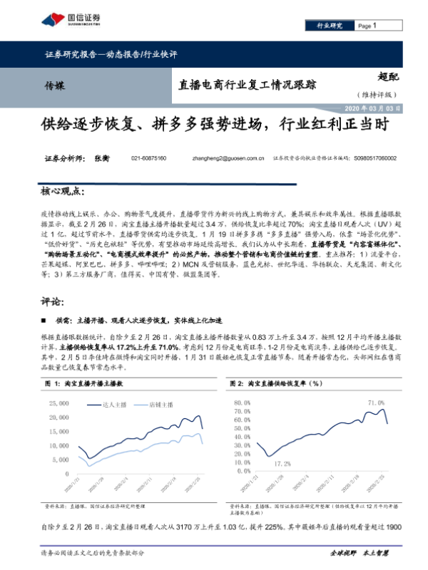 【国信证券】【20200303】直播电商行业复工情况跟踪:供给逐步恢复、拼多多强势进场,行业红利正当时-7页 行业研究