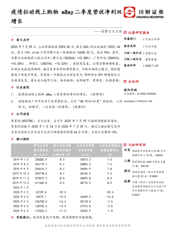 【川财证券】【20200729】消费行业日报:疫情拉动线上购物eBay二季度营收净利双增长-3页 证券期货研究报告