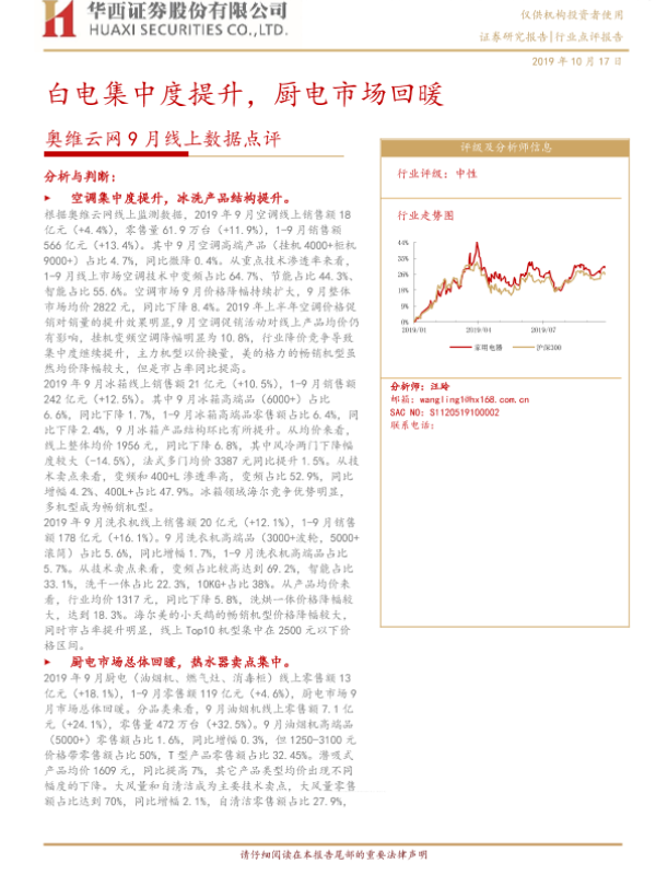 【华西证券】【20191017】奥维云网9月线上数据点评:白电集中度提升,厨电市场回暖-4页 证券期货研究报告