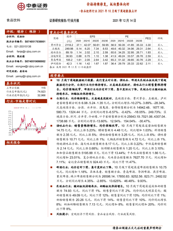 【中泰证券】【20211214】食品饮料行业2021年10月线下商超数据点评:价格持续修复,板块整体向好-10页 行业研究