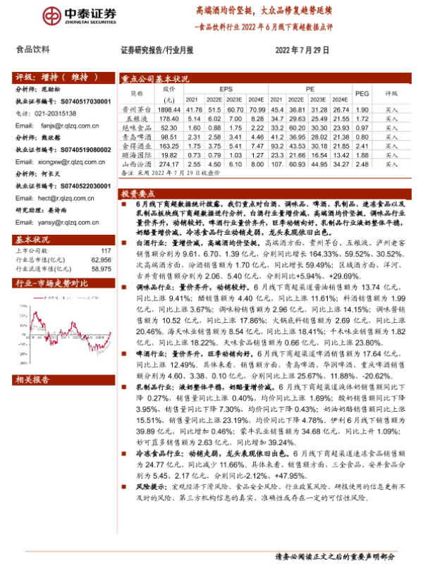 【中泰证券】【20220729】食品饮料行业2022年6月线下商超数据点评:高端酒均价坚挺,大众品修复趋势延续-10页 行业研究