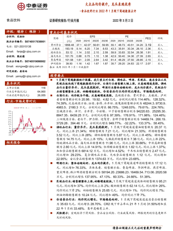 【中泰证券】【20220302】食品饮料行业2022年1月线下商超数据点评:大众品均价提升,龙头表现优秀-11页 行业研究