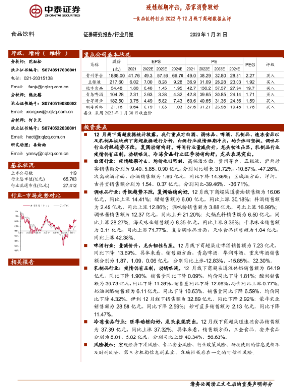 【中泰证券】【20230131】食品饮料行业2022年12月线下商超数据点评:疫情短期冲击,居家消费较好-10页 行业研究