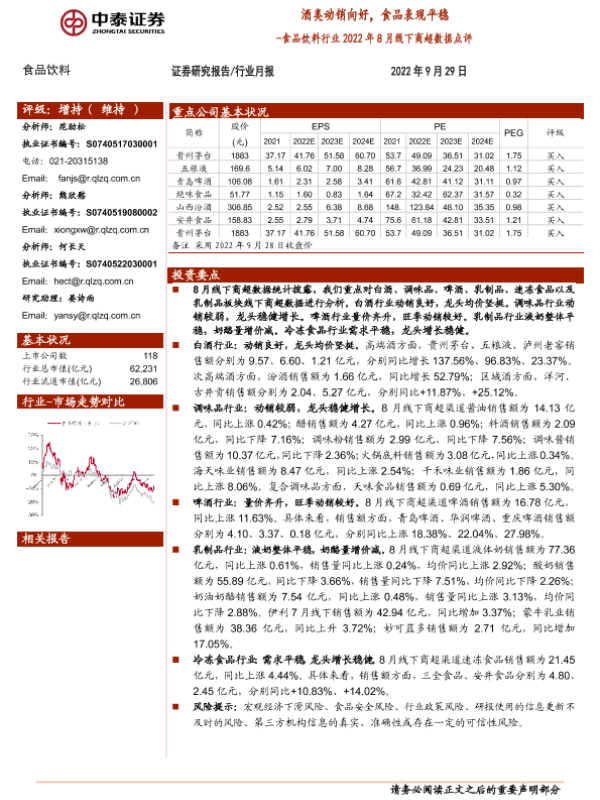【中泰证券】【20220929】食品饮料行业2022年8月线下商超数据点评:酒类动销向好,食品表现平稳-10页 行业研究