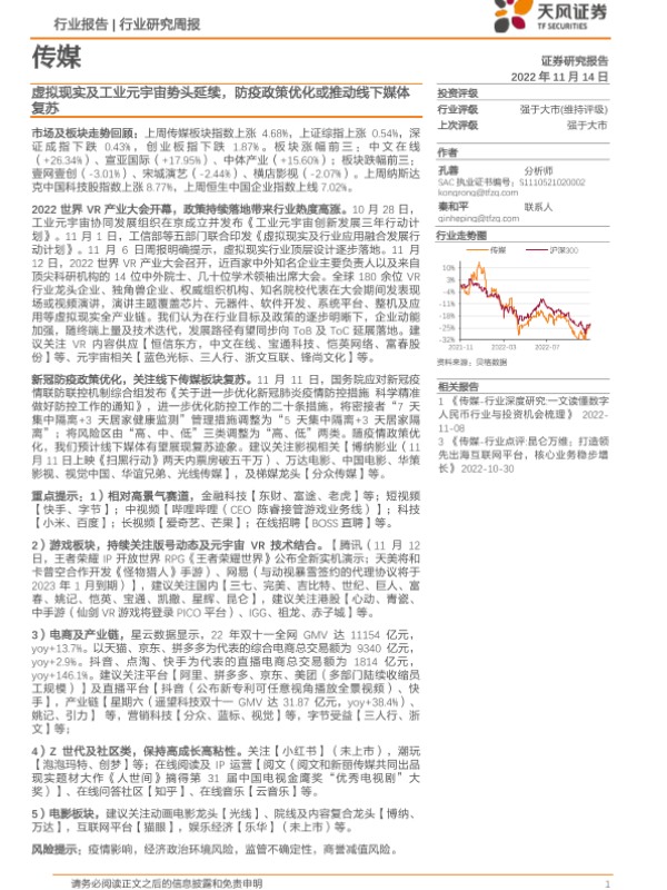 【天风证券】【20221114】传媒行业研究周报:虚拟现实及工业元宇宙势头延续,防疫政策优化或推动线下媒体复苏-15页 行业研究