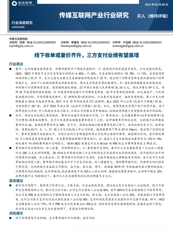 【国金证券】【20230208】传媒互联网产业行业深度研究:线下收单或量价齐升,三方支付业绩有望高增-19页 行业研究