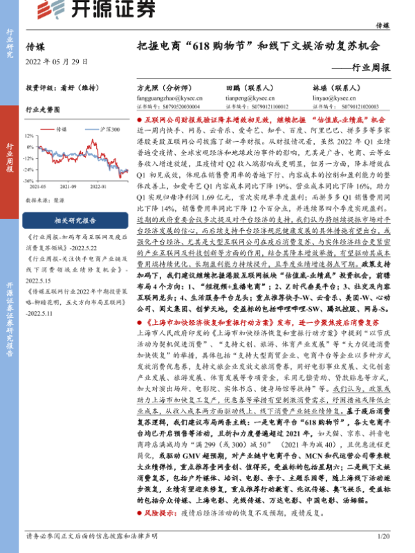 【开源证券】【20220529】传媒行业周报:把握电商“618购物节”和线下文娱活动复苏机会-20页 行业研究