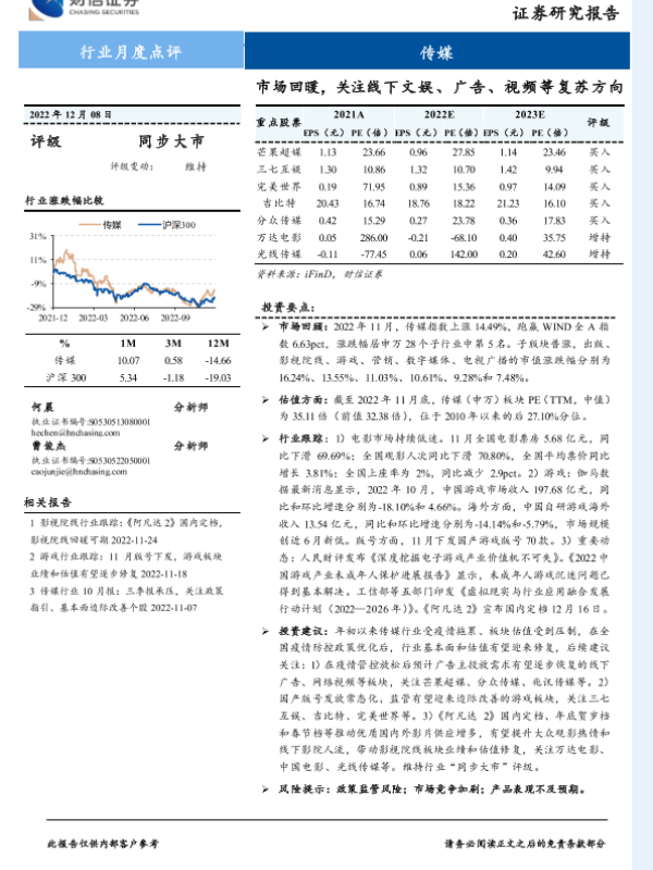【财信证券】【20221208】传媒行业月度点评:市场回暖,关注线下文娱、广告、视频等复苏方向-13页 行业研究