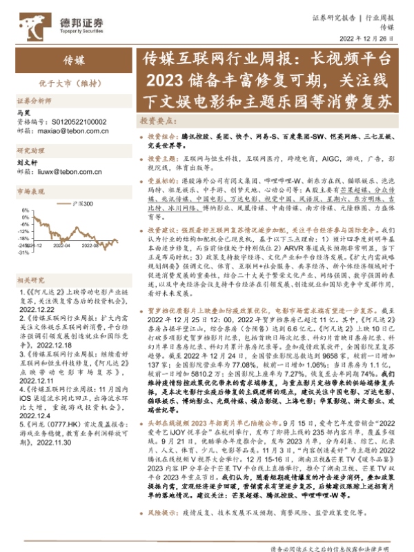 【德邦证券】【20221226】传媒互联网行业周报:长视频平台2023储备丰富修复可期,关注线下文娱电影和主题乐园等消费复苏-16页 行业研究