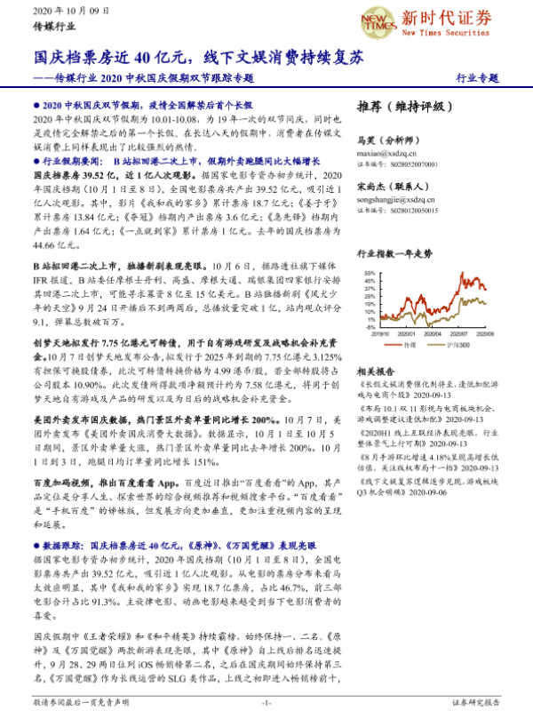 【新时代证券】【20201009】传媒行业2020中秋国庆假期双节跟踪专题:国庆档票房近40亿元,线下文娱消费持续复苏-11页 行业研究