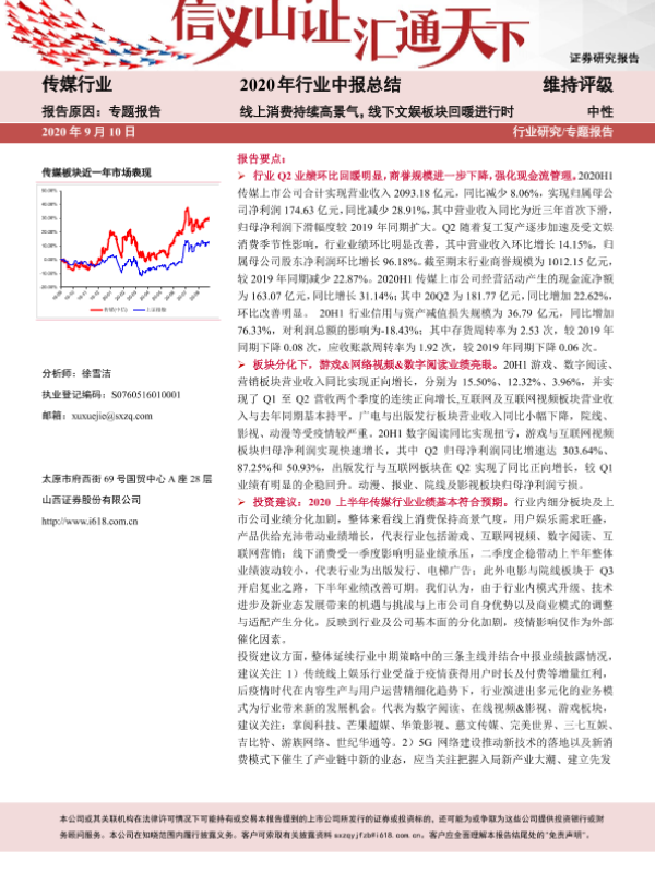 【山西证券】【20200910】传媒行业2020年行业中报总结:线上消费持续高景气,线下文娱板块回暖进行时-36页 行业研究