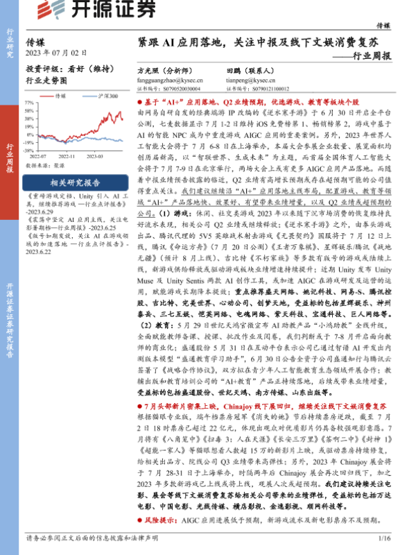 【开源证券】【20230702】传媒行业周报:紧跟AI应用落地,关注中报及线下文娱消费复苏-16页 行业研究