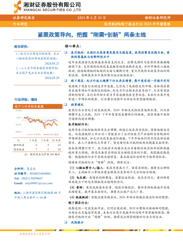 【湘财证券】【20240624】医疗耗材&线下药店行业2024年中期策略:紧跟政策导向,把握“刚需+创新”两条主线-28页 行业研究