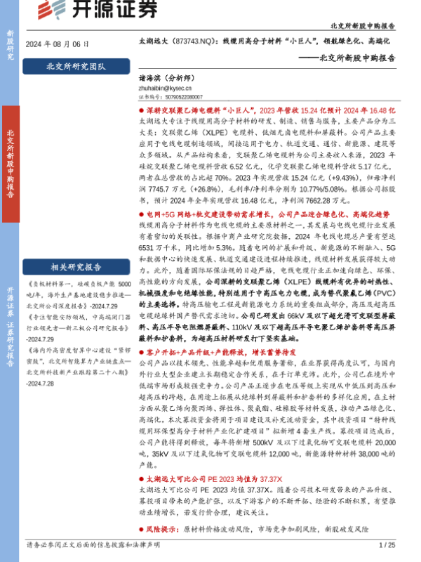 【开源证券】【20240806】太湖远大(873743)北交所新股申购报告:线缆用高分子材料“小巨人”,领航绿色化、高端化-25页 行业研究