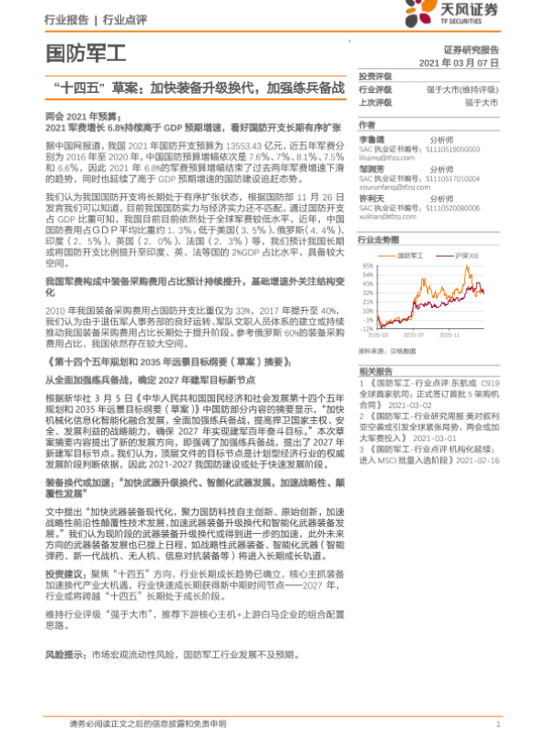 【天风证券】【20210307】国防军工:“十四五”草案:加快装备升级换代,加强练兵备战-2页 行业研究