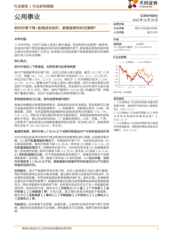 【天风证券】【20221220】公用事业行业研究周报:组件价格下滑+配储成本抬升,新能源盈利如何演绎?-14页 行业研究