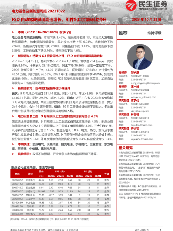 【民生证券】【20231022】电力设备及新能源周报:FSD自动驾驶里程高速增长,组件出口金额环比提升-25页 行业研究