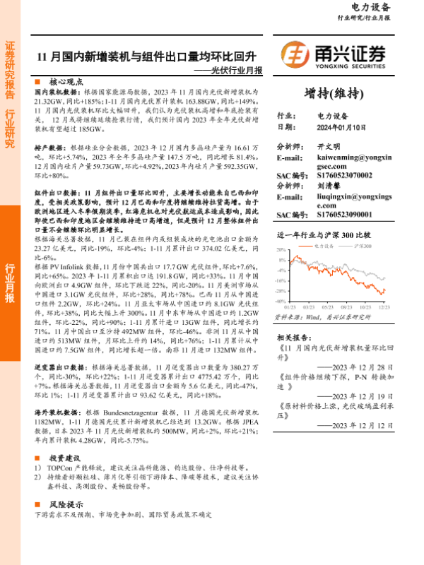 【甬兴证券】【20240110】20240110-甬兴证券-光伏行业月报:11月国内新增装机与组件出口量均环比回升-15页 行业研究