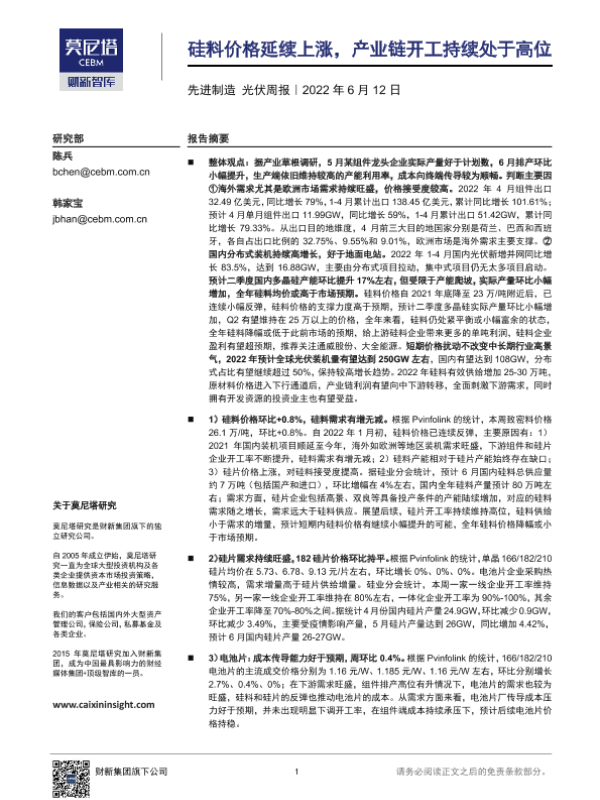 【莫尼塔研究】【20220612】先进制造光伏周报:硅料价格延续上涨,产业链开工持续处于高位-15页 行业研究