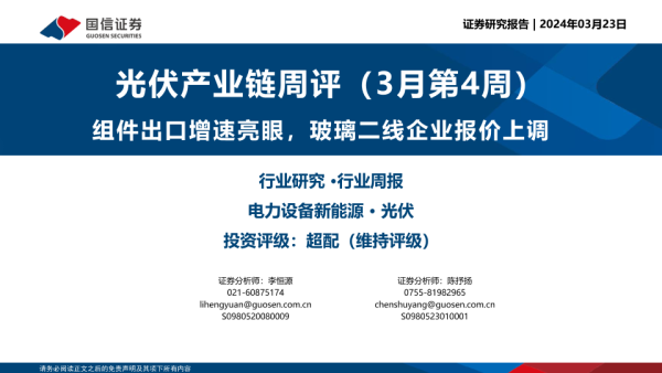 【国信证券】【20240323】光伏产业链周评(3月第4周):组件出口增速亮眼,玻璃二线企业报价上调-19页 行业研究