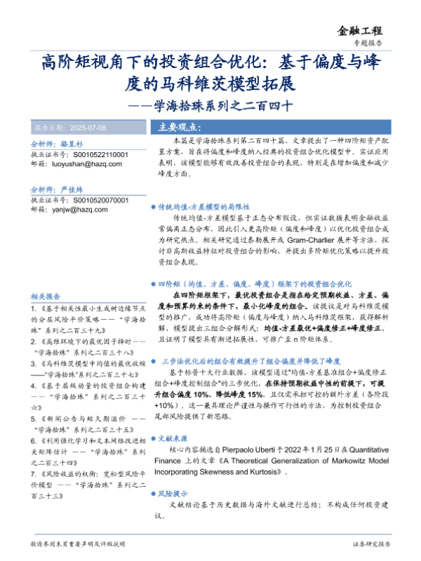 【华安证券】【20250708】高阶矩视角下的投资组合优化:基于偏度与峰度的马科维茨模型拓展-14页 证券期货研究报告