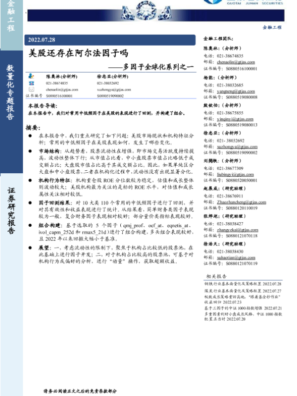 【国泰君安证券】【20220728】美股还存在阿尔法因子吗-24页 行业研究