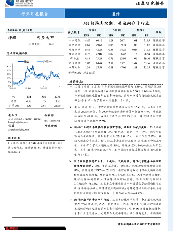 【财信证券】【20191114】通信行业月度报告:5G切换真空期,关注细分子行业-11页 行业研究