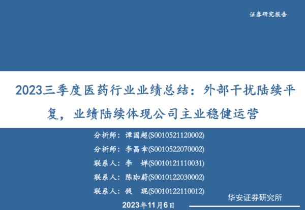 【华安证券】【20231106】2023三季度医药行业业绩总结:外部干扰陆续平复,业绩陆续体现公司主业稳健运营-25页 行业研究