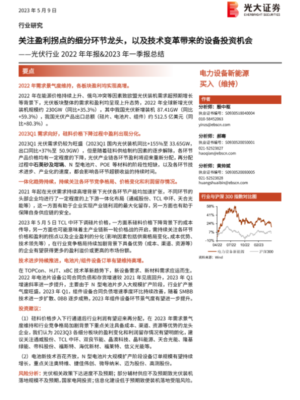 【光大证券】【20230509】光伏行业2022年年报&2023年一季报总结:关注盈利拐点的细分环节龙头,以及技术变革带来的设备投资机会-11页 行业研究