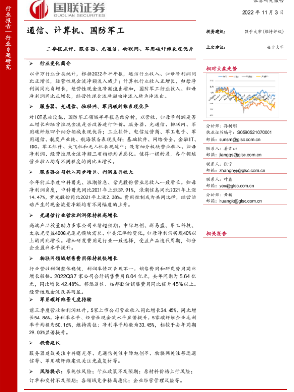 【国联证券】【20221103】通信、计算机、国防军工行业三季报点评:服务器、光通信、物联网、军用碳纤维表现优异-52页 行业研究