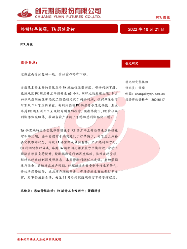 【创元期货】【20221021】PTA周报:终端订单偏弱,TA弱势看待-34页 行业研究