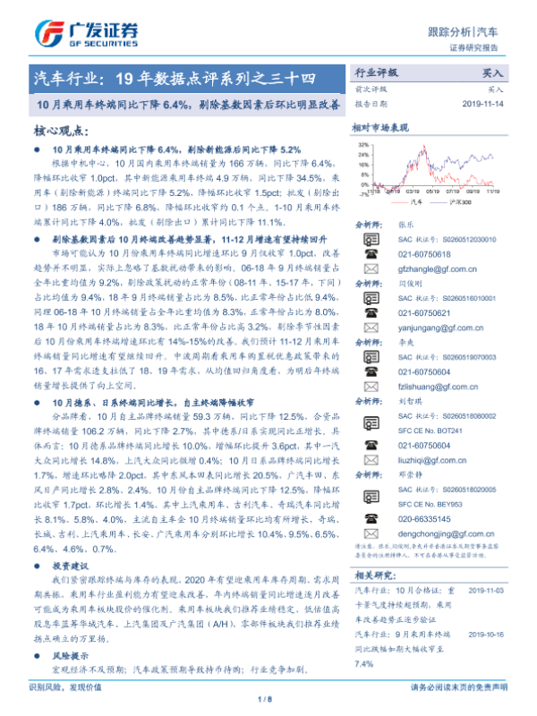 【广发证券】【20191114】19年数据点评系列之三十四:10月乘用车终端同比下降6.4%,剔除基数因素后环比明显改善-8页 行业研究