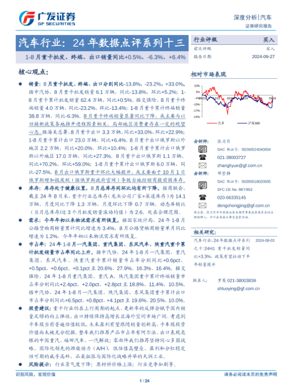 【广发证券】【20240927】24年数据点评系列十三,1-8月重卡批发、终端、出口销量同比+0.5%、-6.3%、+6.4%-24页 行业研究