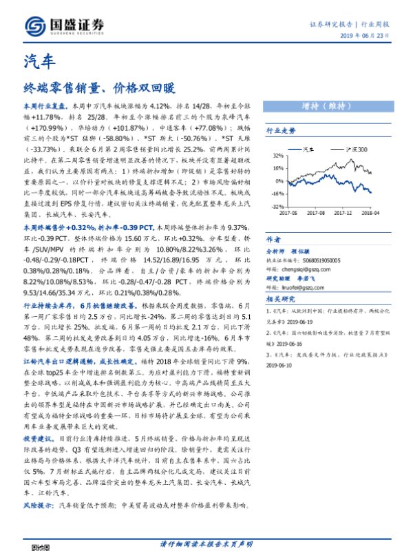 【国盛证券】【20190623】20190623-国盛证券-汽车行业周报:终端零售销量、价格双回暖-15页 行业研究