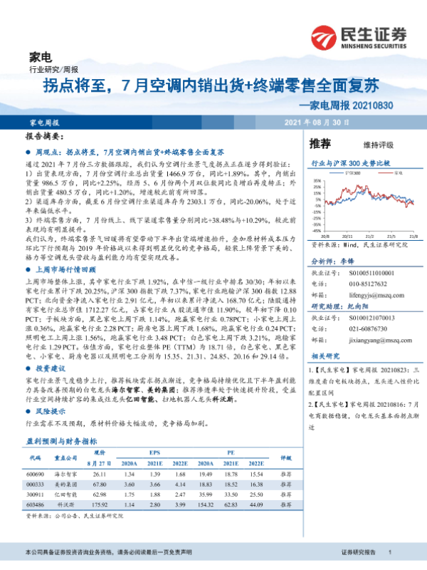 【民生证券】【20210830】家电周报:拐点将至,7月空调内销出货+终端零售全面复苏-16页 行业研究