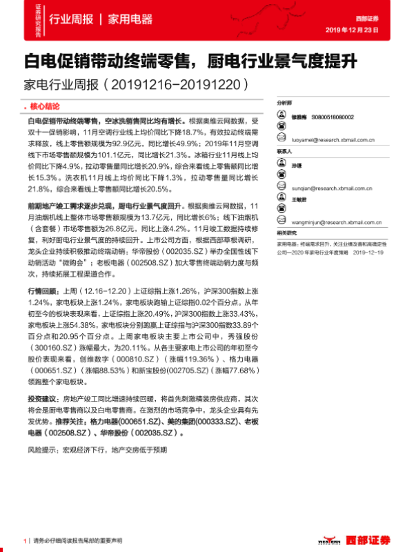 【西部证券】【20191223】20191223-西部证券-家电行业周报:白电促销带动终端零售,厨电行业景气度提升-8页 行业研究