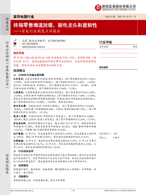 【浙商证券】【20211007】20211007-浙商证券-家电行业周度点评报告:终端零售增速放缓,厨电龙头彰显韧性-16页 行业研究