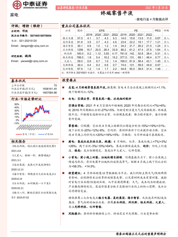 【中泰证券】【20210524】家电行业4月数据点评:终端零售平淡-14页 行业研究